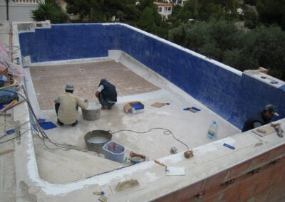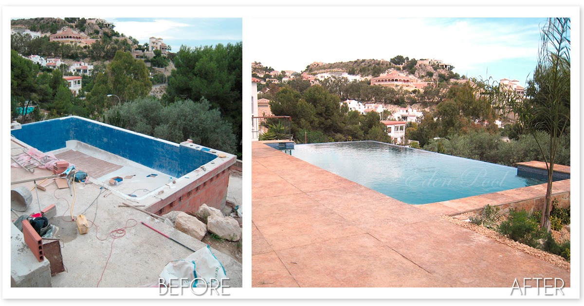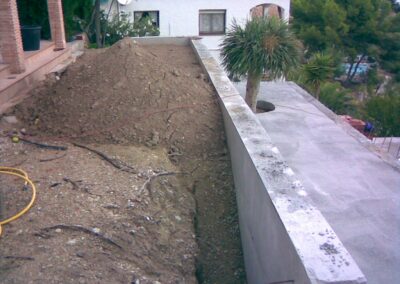 The job is located in Coveta Fuma, El Campello, Alicante, where the landscape is very rocky, uneven, so even that the garden had a huge level difference, from the house to the street level, the client decided to have an Infinity Pool. Because of the level differences, we had to build a very solid structure, so the weight of the pool, plus the 60m³ of water, to hold in place and avoid any movement in time.