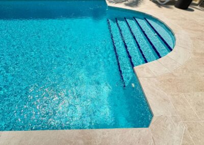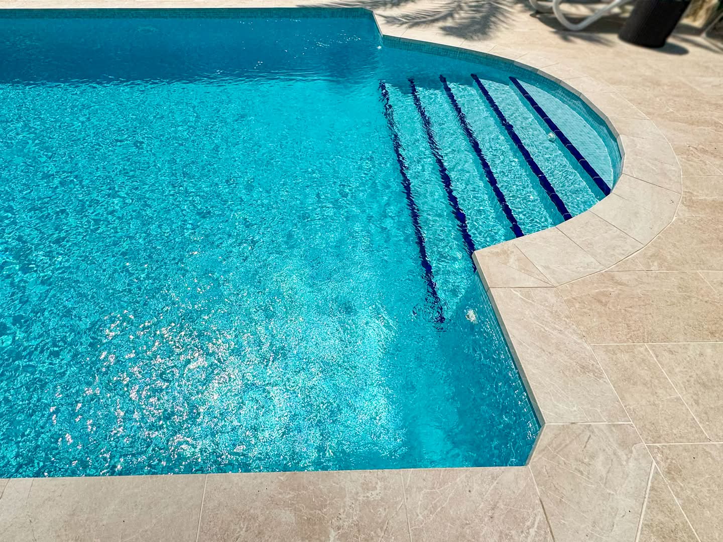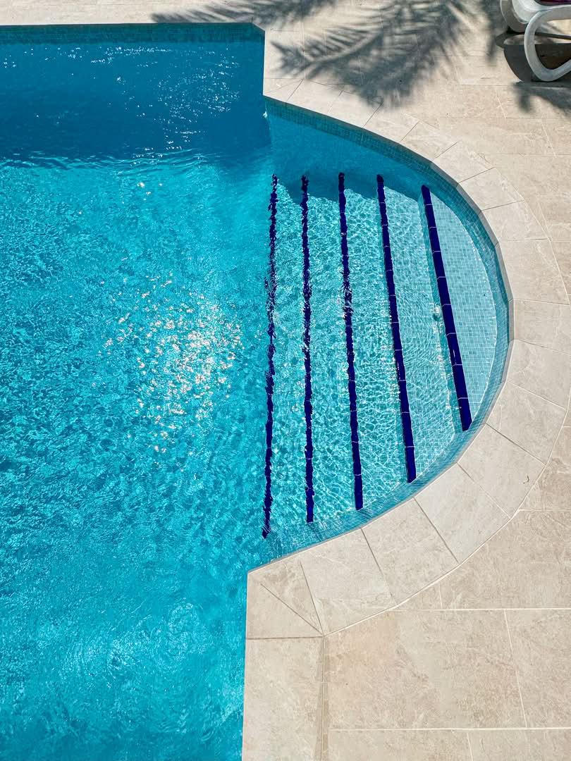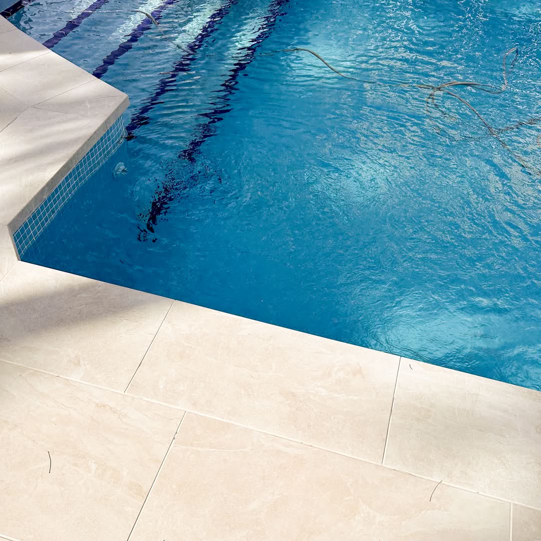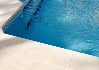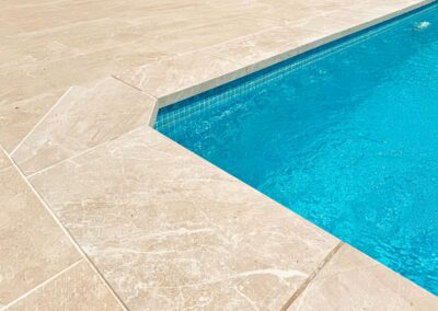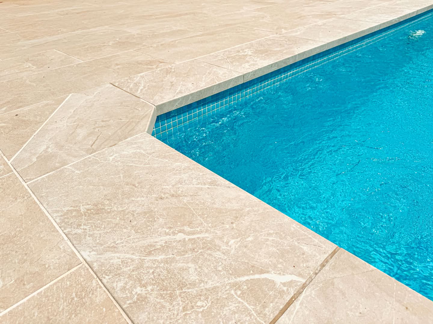 To complement the design, we installed cream-toned tiles around the pool, creating a warm and inviting atmosphere, ideal for relaxing, soaking up the sun, or hosting unforgettable summer parties.